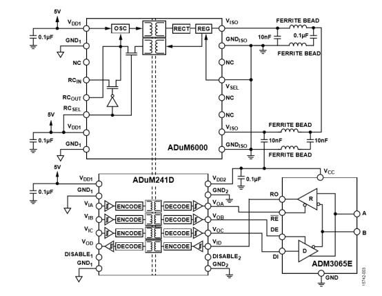 利用iCoupler和isoPower技術(shù),可以向ADM3065E中增添兼具加強(qiáng)絕緣和5kV rms瞬態(tài)耐受電壓的電流隔離。ADuM6401提供了所需的四通道5kV rms信號(hào)隔離、最高 25 Mbps 的工作速率以及集成式DC/DC轉(zhuǎn)換器。ADuM6401配合ADM3065E(如圖1所示)需將VISO引腳配置為3.3V,具體方法是將VSEL引腳連接到GNDISO引腳,并將5V電源連接到VDD1引腳。在3.3V電壓下工作,即使數(shù)據(jù)速率達(dá)25Mbps,也可以確保ADM3065E 仍保持在ADuM6401的負(fù)載能力范圍內(nèi)。利用ADuM241D四通道數(shù)字隔離器和ADuM6000隔離式DC/DC轉(zhuǎn)換器,可以實(shí)現(xiàn)50Mbps數(shù)據(jù)速率以及ADM3065E隔離,如圖2所示。ADuM241D的數(shù)據(jù)速率最高可達(dá)150Mbps,能夠提供完全支持ADM3065E以50Mbps數(shù)據(jù)速率工作所需的精確時(shí)序。