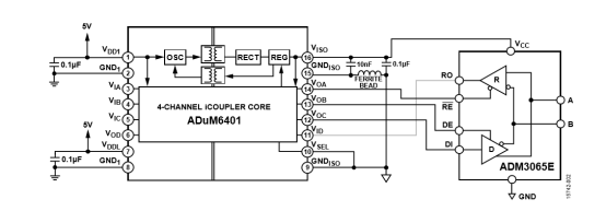 不過,以50Mbps數(shù)據(jù)速率工作的前提是使ADM3065E工作在3.3V電壓下。如果需要在5V電壓下工作,可以將ADuM6000上的VSEL引腳連接到VISO,但支持的最大數(shù)據(jù)速率會(huì)降低(例如,<10 Mbps)。更多信息,請(qǐng)參考ADuM241D和ADuM6000數(shù)據(jù)手冊(cè)。ADuM6401和ADuM6000isoPower器件中的DC/DC轉(zhuǎn)換器可為ADM3065E(和ADuM241D)提供穩(wěn)壓隔離電源。這兩款isoPower器件利用高頻開關(guān)元件,通過變壓器傳輸功率。用戶必須遵循輻射標(biāo)準(zhǔn)進(jìn)行印刷電路板 (PCB)布局。